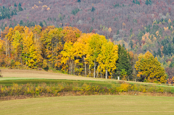 Ein weiter Blick in das sich herbstlich färbende Land. Rechts der Hohe Bogen mit seinen Türmen, mittig der Osser im Dunst. Der noch belaubte Wald geht über von Grüntönen in gelb, rot, rotbraun. Noch ist es sonnig, doch die dunklen, nebligen Tage stehen kurz bevor. Der Sommer verabschiedet sich mit einem letzten, beinahe wolkenlosem Gruß.